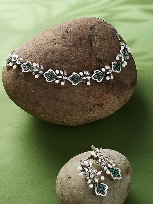 Chic Emerald Twist: Rhodium Choker & Earring Set