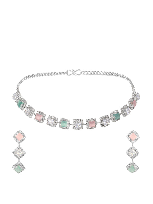 Silver-Plated American Diamond Necklace Set With Drop Earring