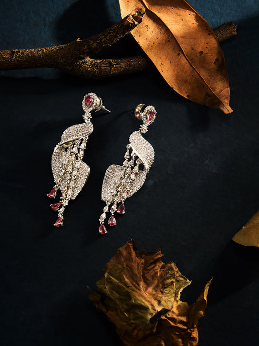 Silver-Plated Red Ruby AD & CZ Studded Contemporary Shaped Drop Earrings