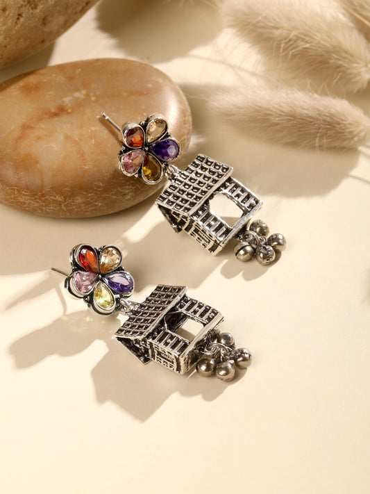 Silver-Plated AD Studded House Shaped Oxidised Drop Earrings