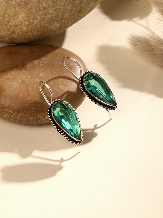 Silver-Plated Emerald Studded Oxidised Teardrop Shaped Hoop Earrings