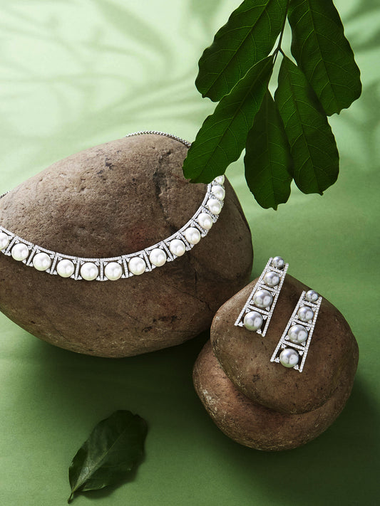 Rhodium-Plated Cubic Zirconia & Pearls Studded Jewellery Set