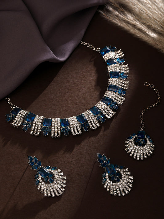 Rhodium Plated Royal Blue And White Stone Studded Choker Jewellery Set