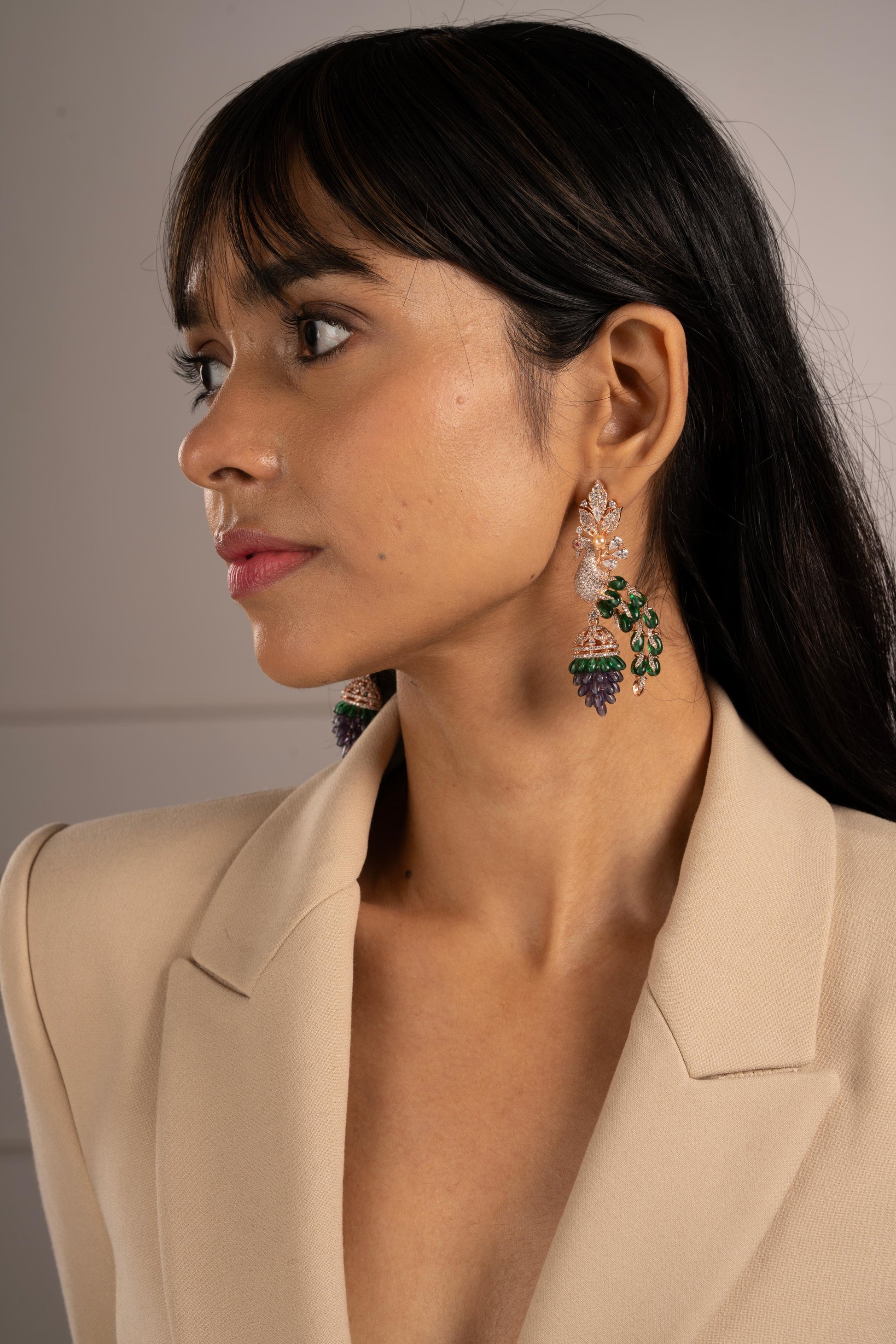 Asmitta Jewellery presents premium luxury peacock-inspired dangle earrings with gold-tone detailing, green enamel accents, and stone drops — perfect for festive and traditional looks