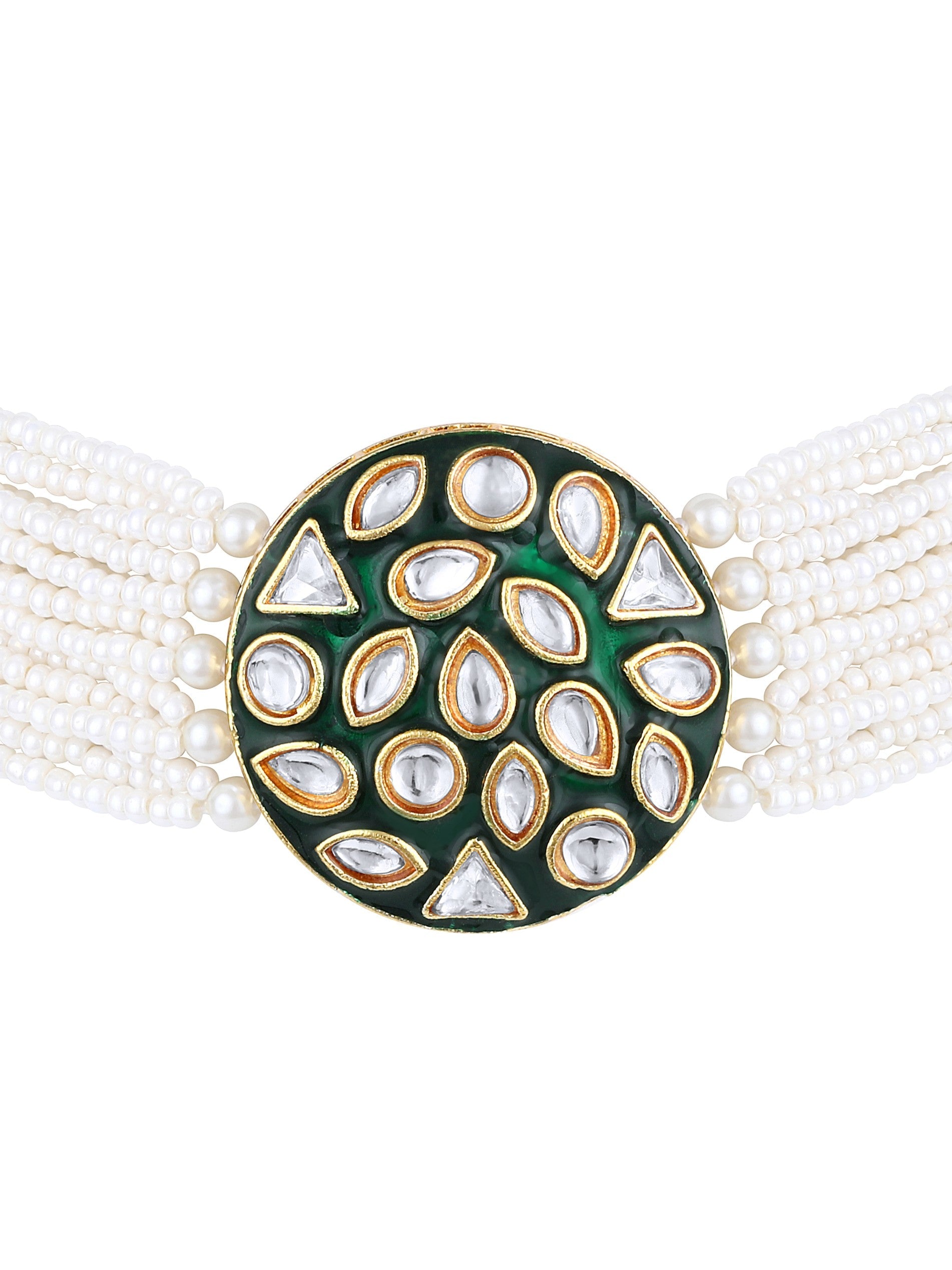 Asmitta Jewellery women's white/ green Kundan Pearl Necklace set crafted in premium Alloy with elegant Gold Plated. This Necklace set blends timeless beauty with modern sophistication, making it perfect