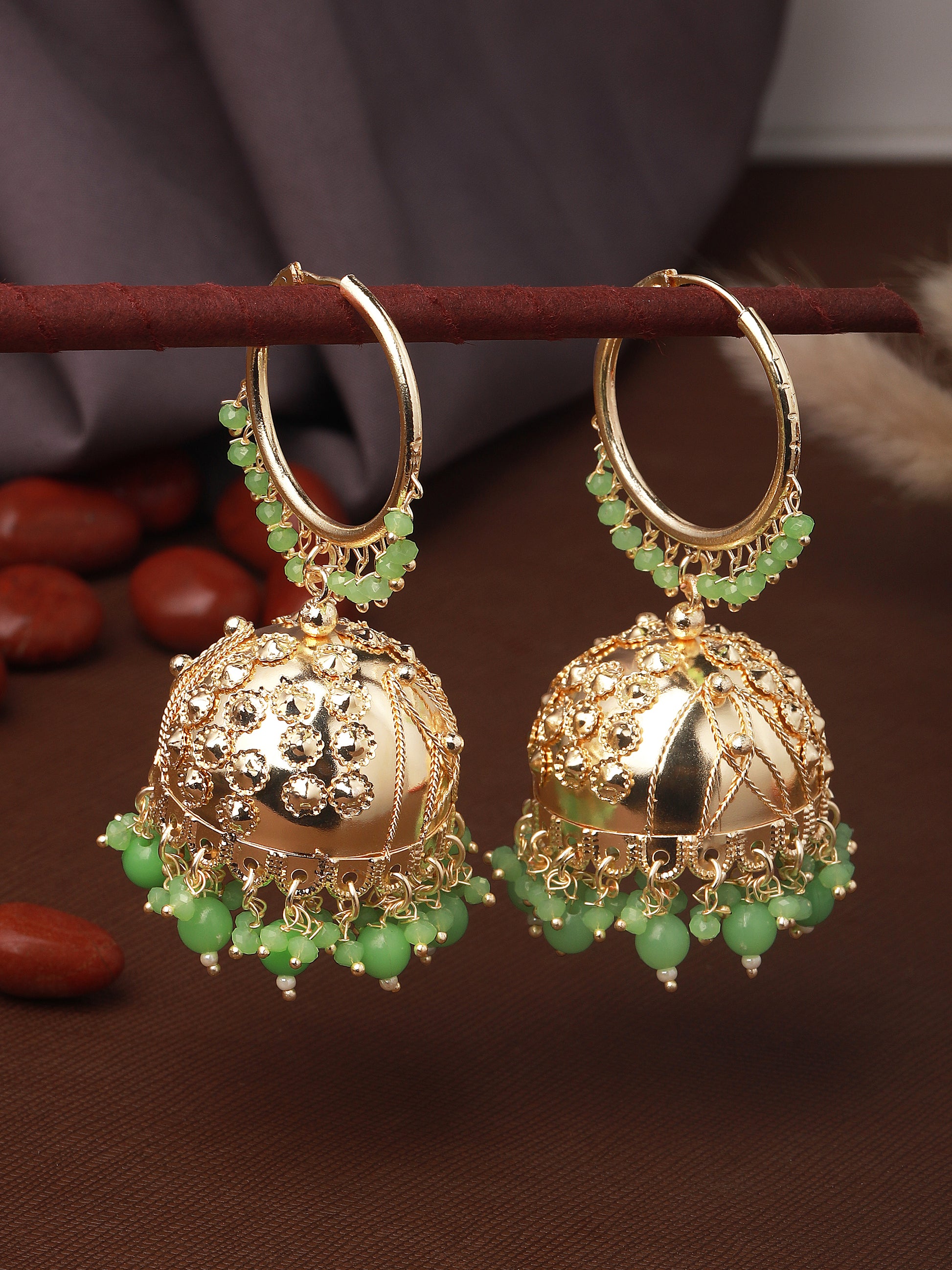 22k Gold-plated & green dome shaped jhumkas, has pearls beaded