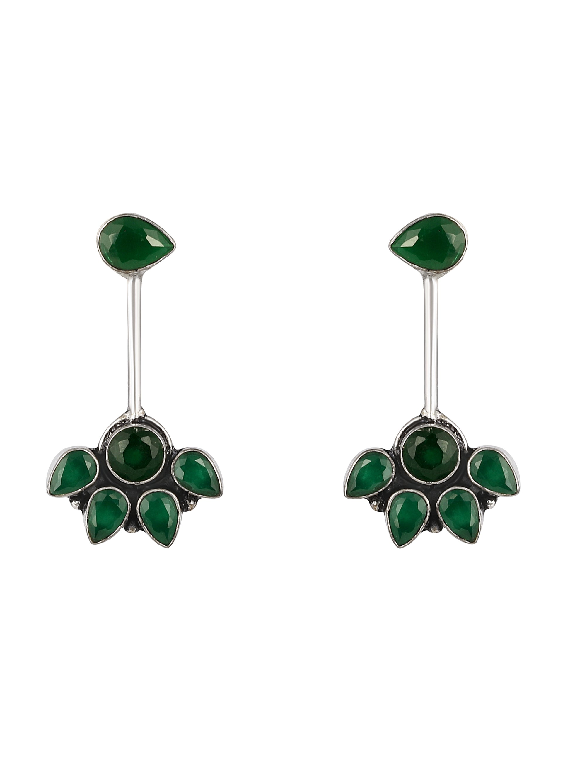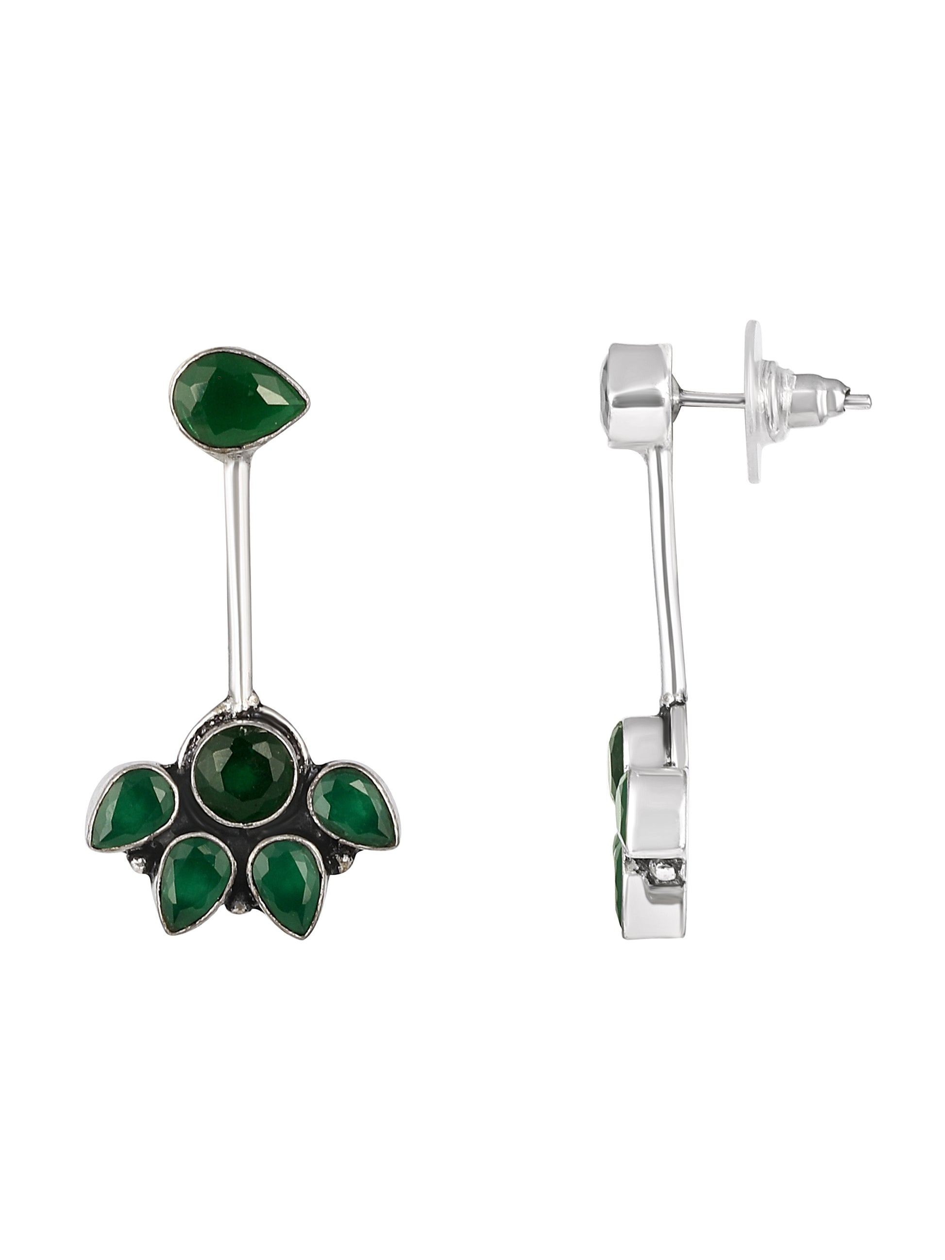 Silver-Plated Emerald Studded Floral Oxidised Studs