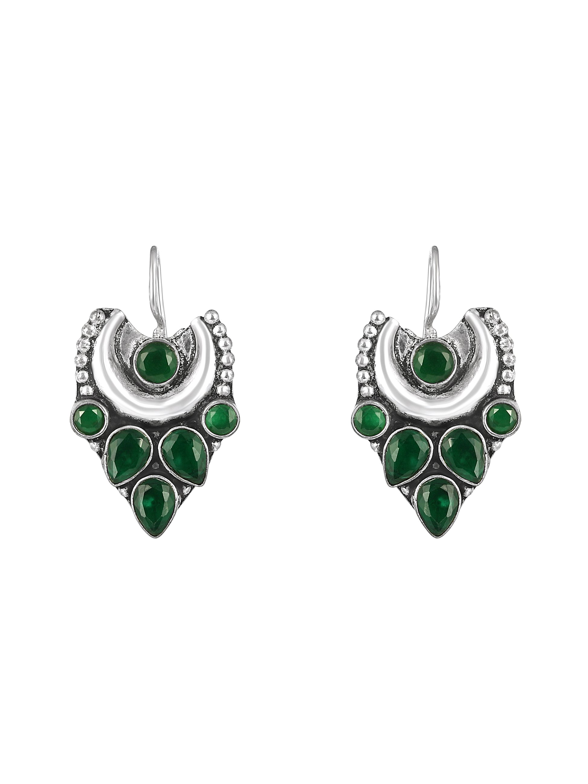 Silver-Plated Emerald Studded Crescent Shaped Oxidised Studs