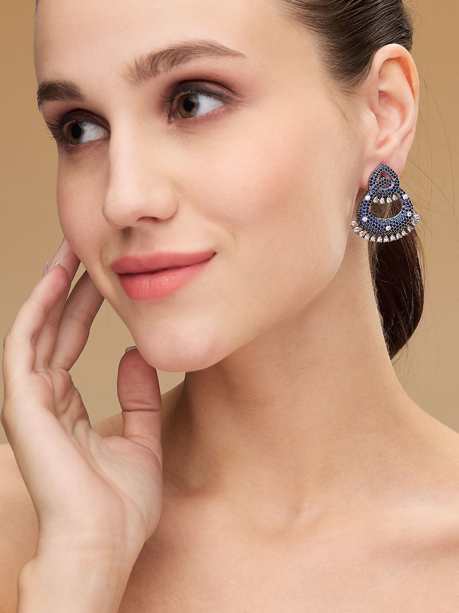 Rhodium-Plated Blue Sapphire & AD Studded Teardrop Shaped Studs
