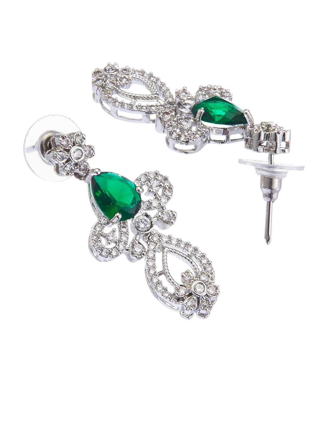 Rhodium-Plated Green Stone Diamond Necklace Set with Earrings