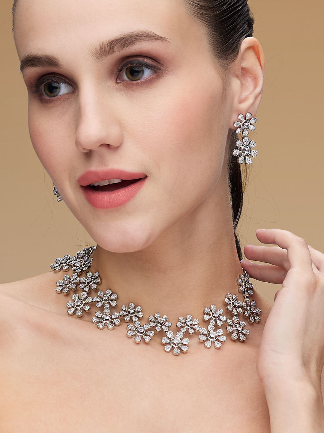Rhodium-Plated Cubic Zirconia Studded Floral Jewellery Set
