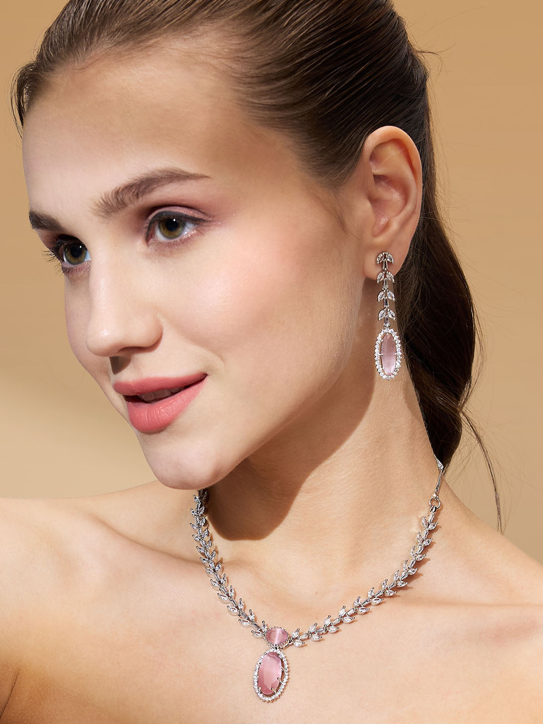 Rhodium-plated necklace, has pink and white American diamond stone-studded details