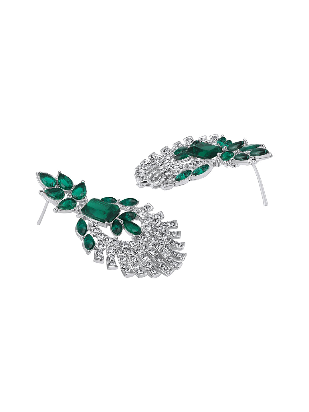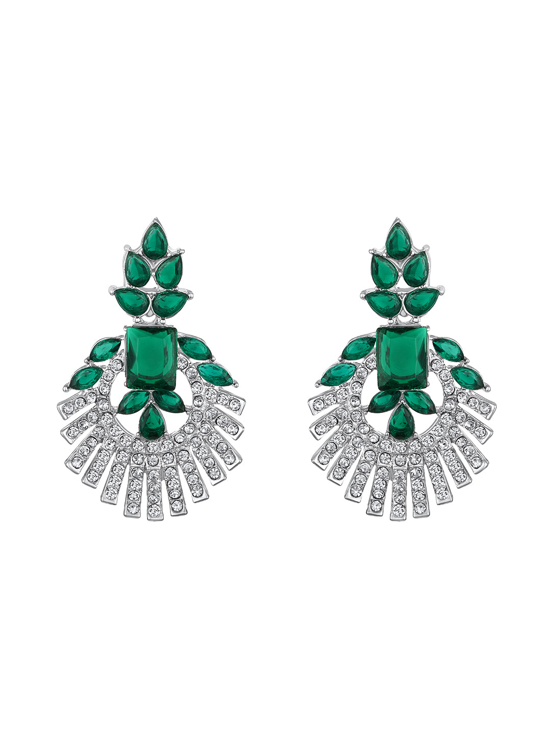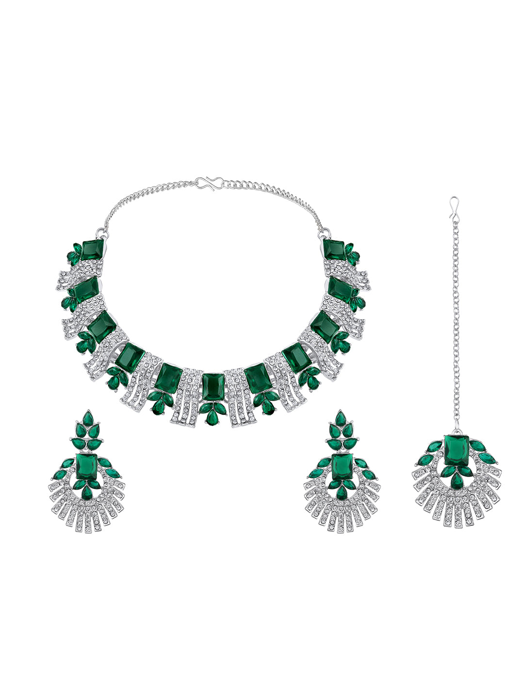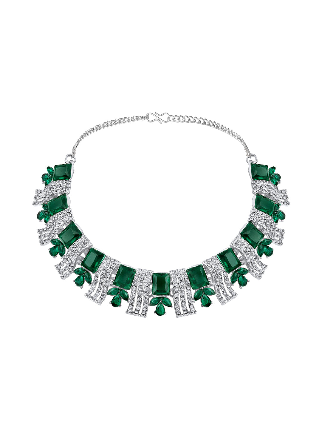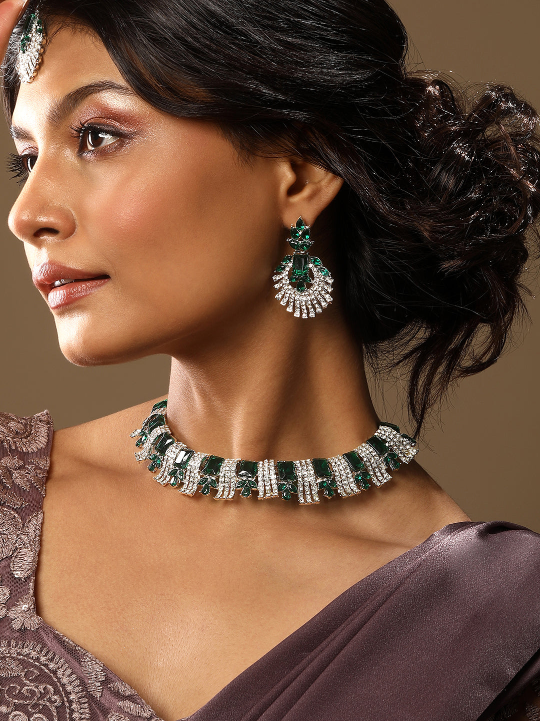 Rhodium Plated Emerald And White Stone Studded Choker Jewellery Set