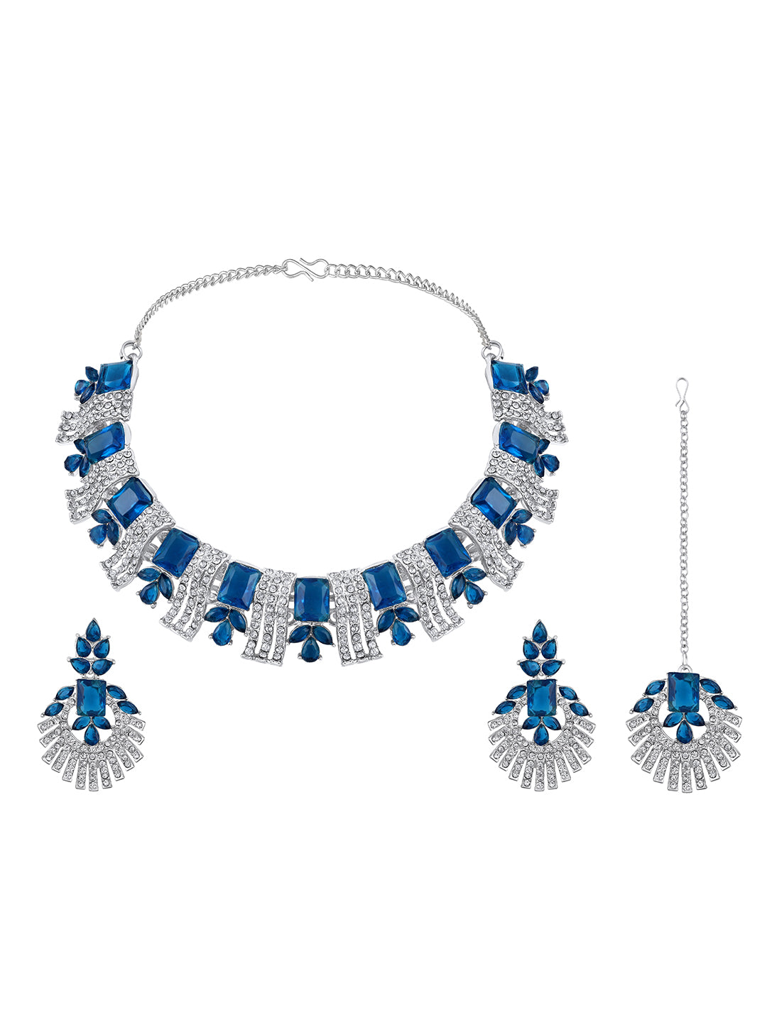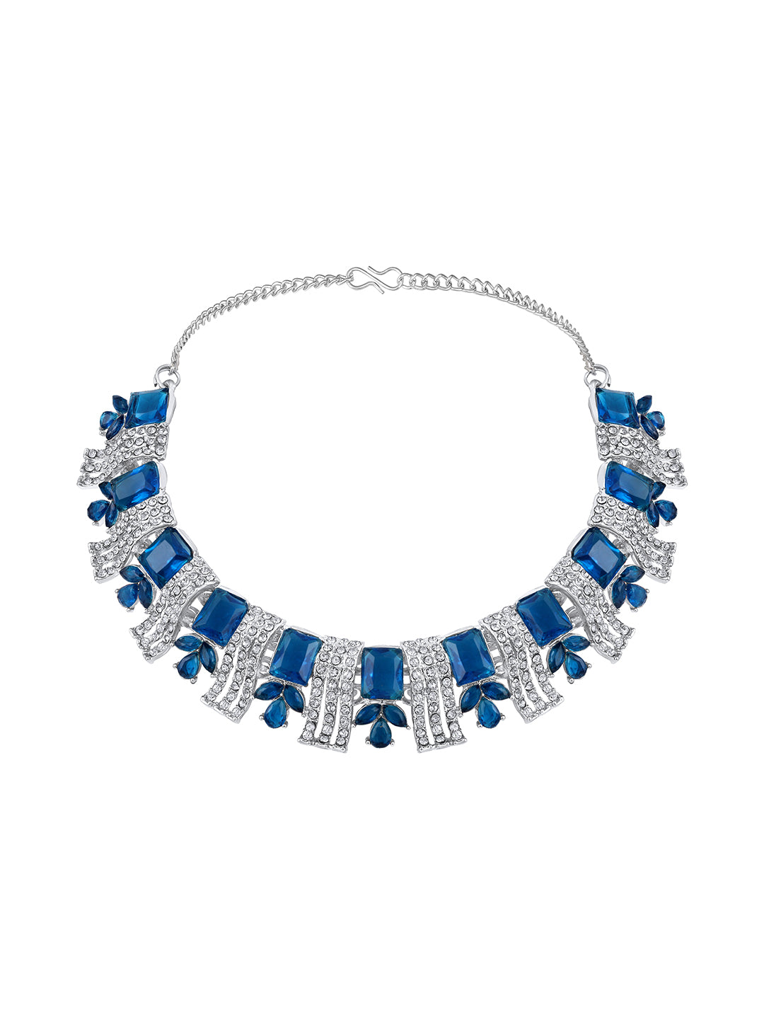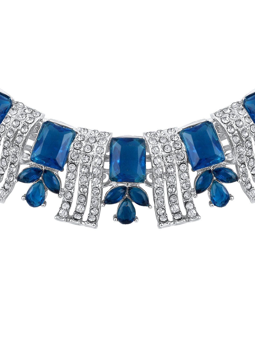 Rhodium Plated Royal Blue And White Stone Studded Choker Jewellery Set