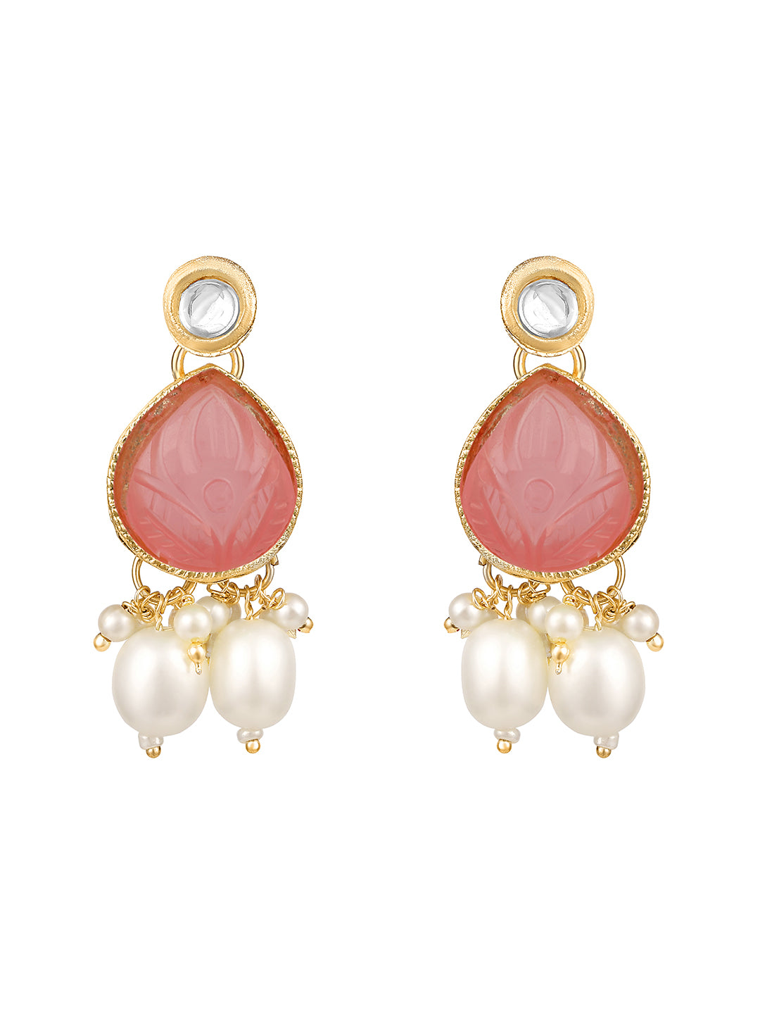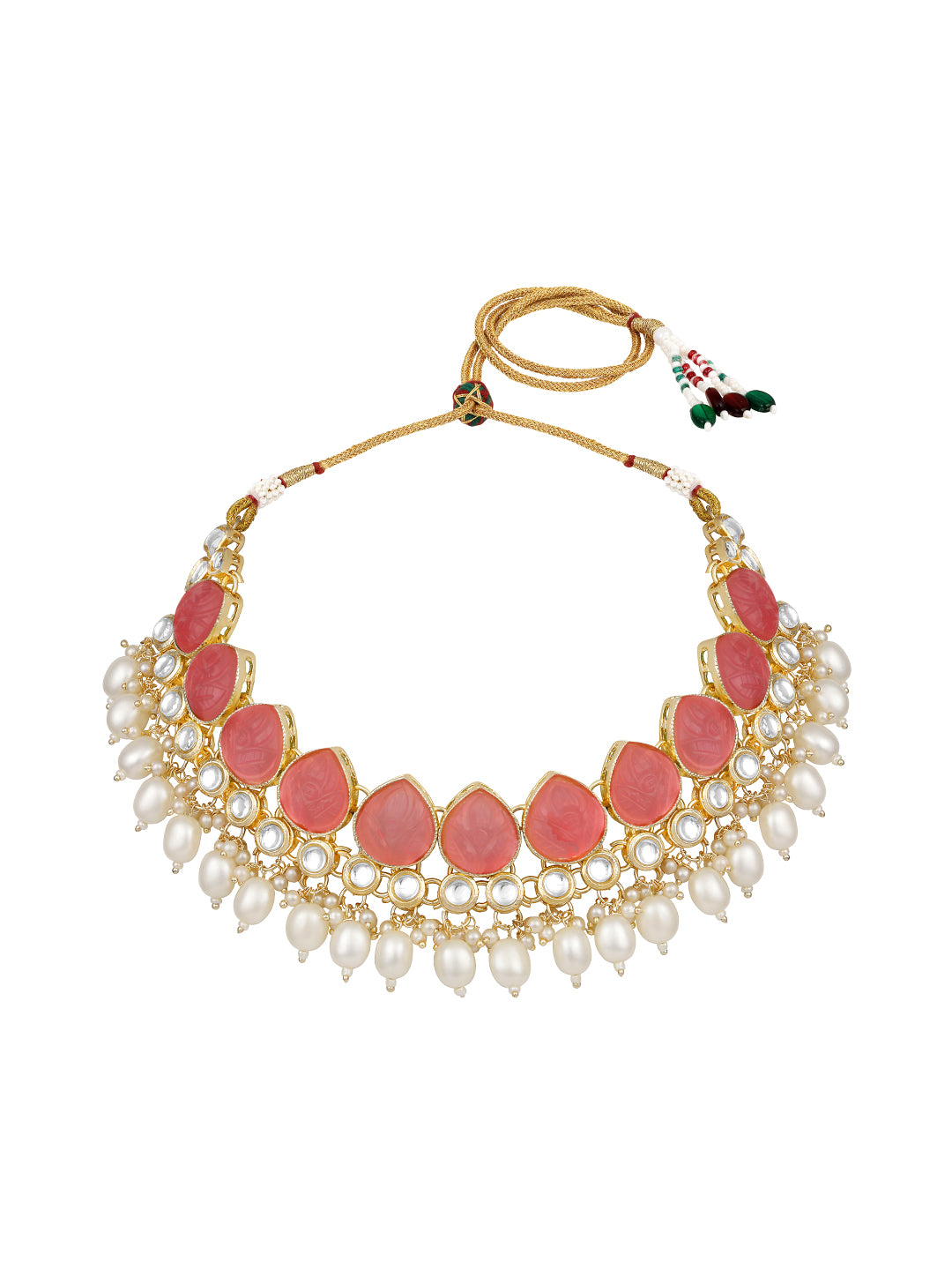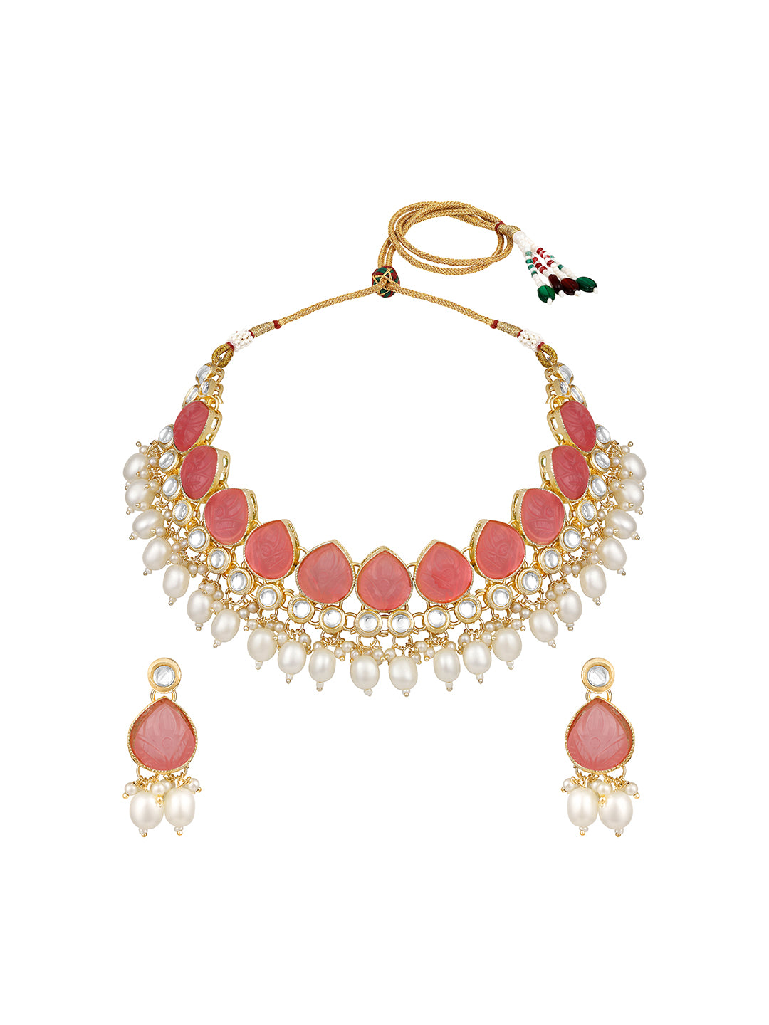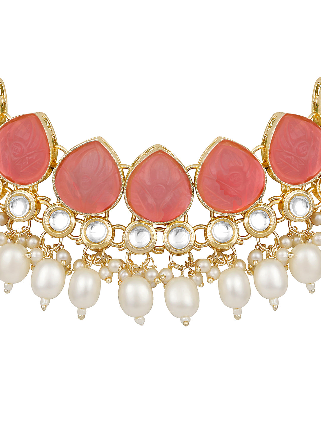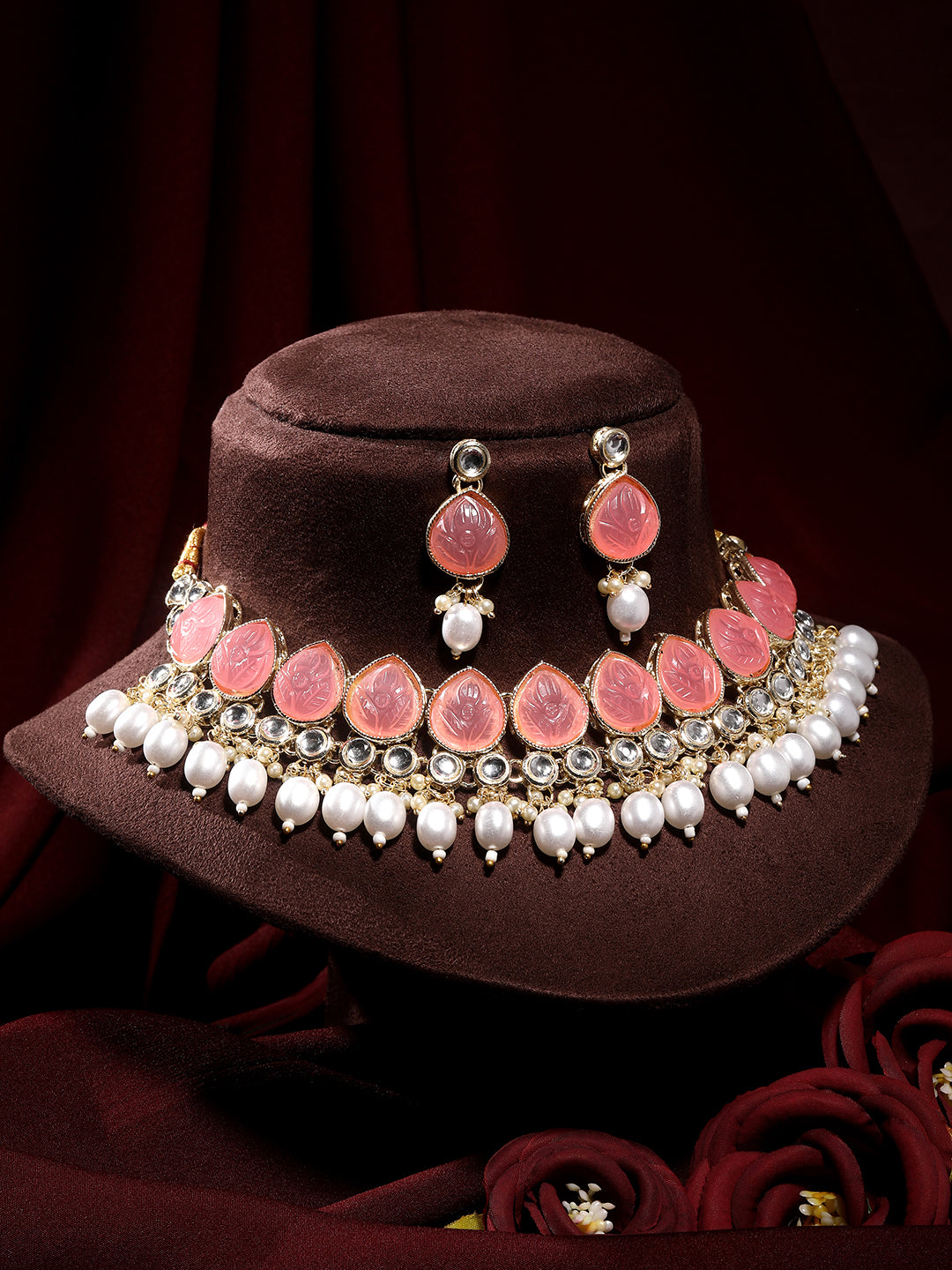 Baby Pink Gold Plated Beaded & Artificial Stone Studded Choker Jewellery Set