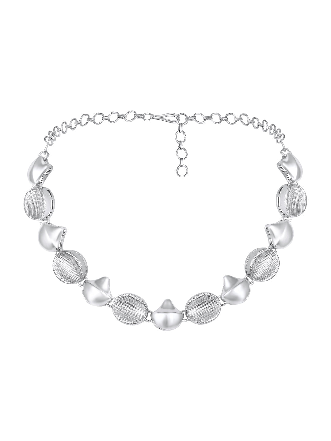 Style Note : Pair this classic rhodium choker set with deep necklines — think boat-neck blouses, off-shoulder gowns, or V-neck kurtas. It complements outfits in neutral, pastel, or jewel tones. Finish the look with sleek hair, minimal makeup, and a silver clutch for a polished, modern vibe.