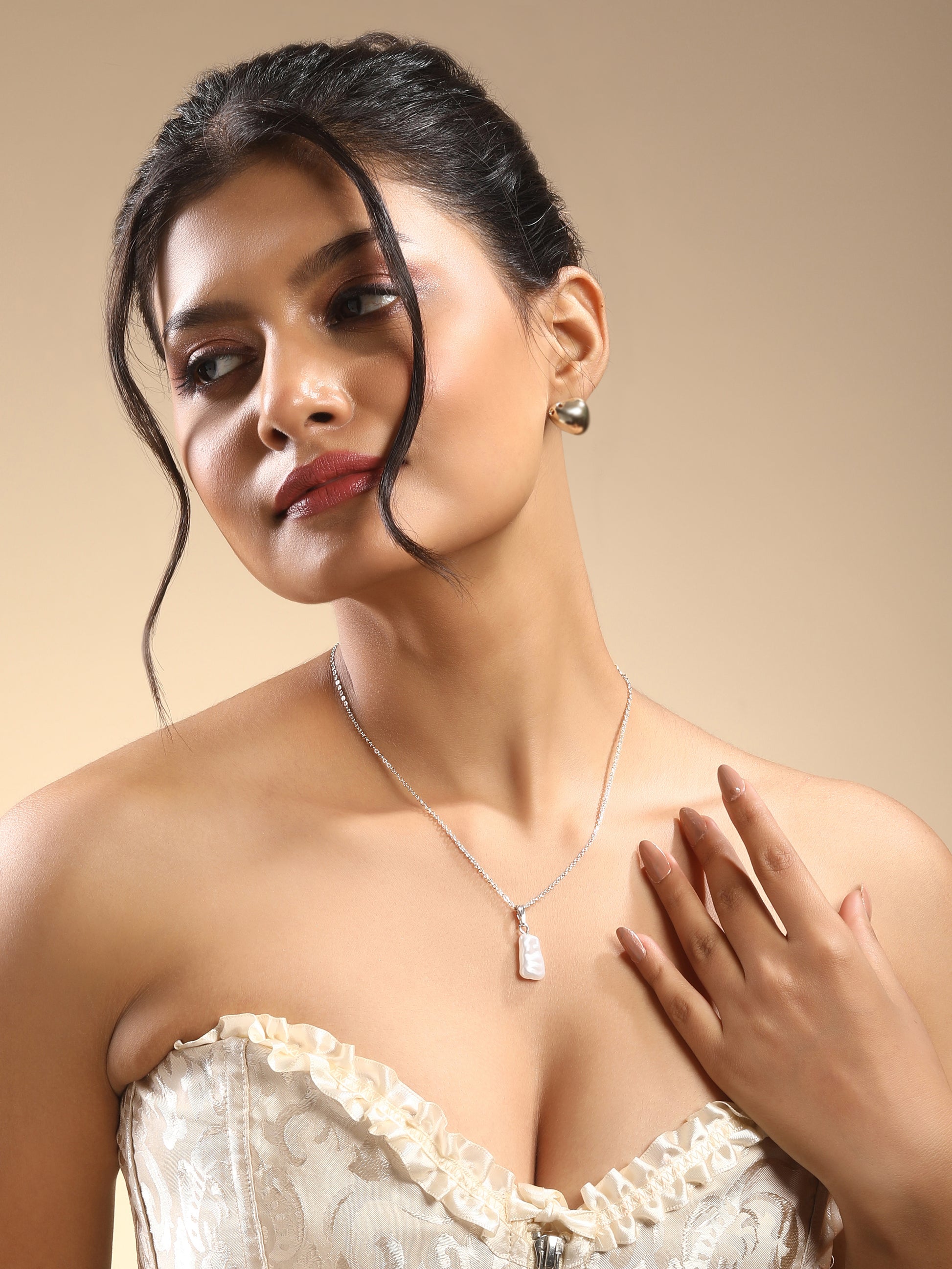 Product Description : Sleek and graceful, this Contemporary Rhodium Plated Pearl Charm Pendant is a modern classic. Its cool-toned rhodium finish combined with a luminous pearl makes it a standout piece that complements both Western and ethnic styles effortlessly.